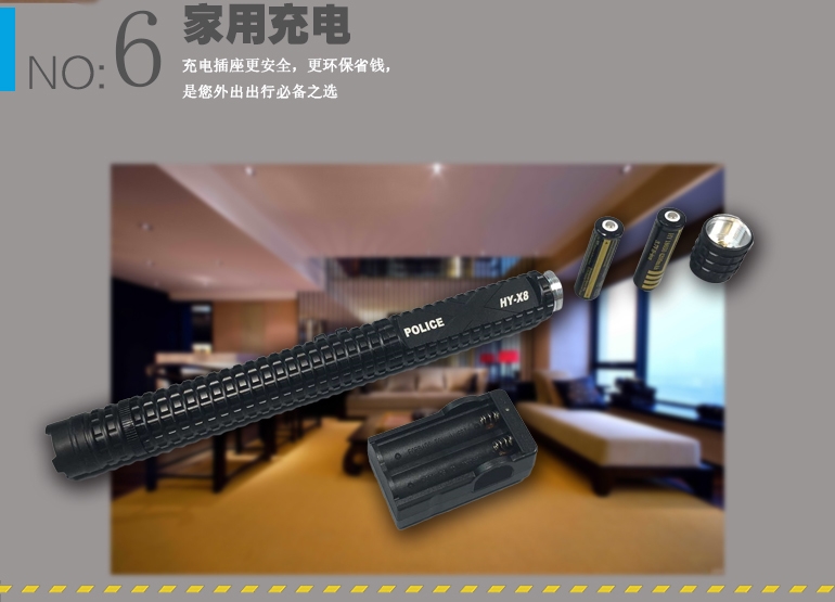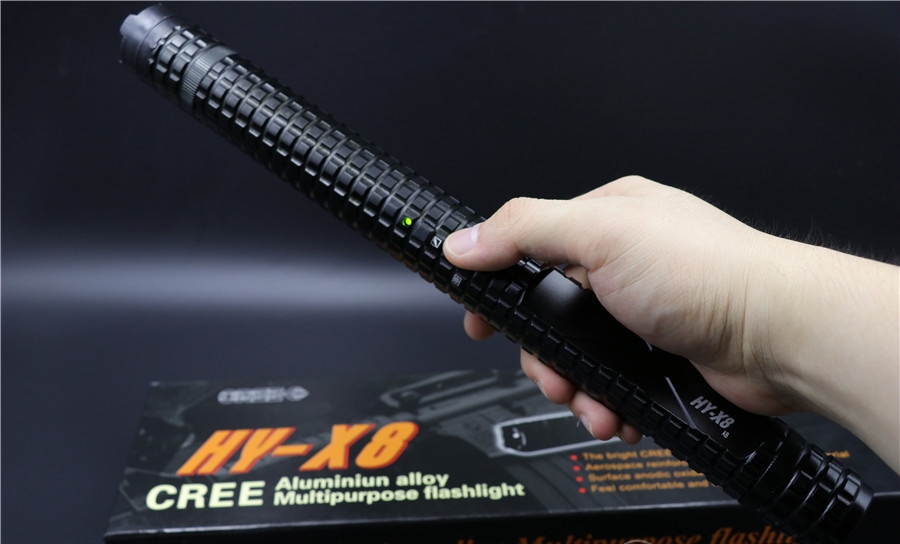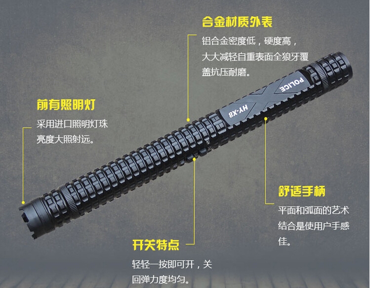 黑鹰x8电棍这款是非常的受欢迎的一款,威力可观、造型炫酷、材质坚硬,可以说是完美的存在了。 全身钛合金打造,更耐击打。两节18650大功率大容量电池,可反复充电。照明灯泡更是采用进口CREE强光灯泡是目前电击棍里面照明距离最远光线最强的合金电击棍