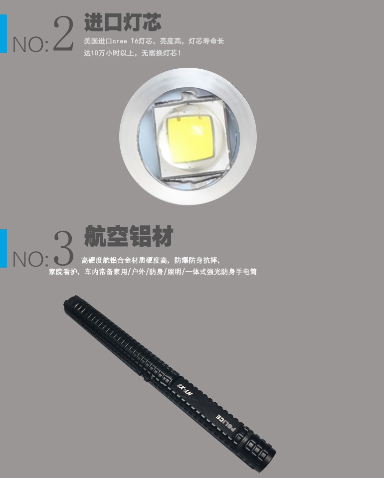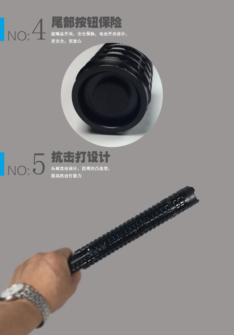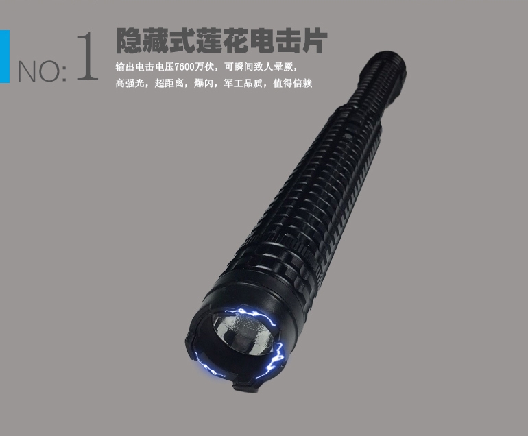 全身钛合金打造,更耐击打。两节18650大功率大容量电池,可反复充电。照明灯泡更是采用进口CREE强光灯泡是目前电击棍里面照明距离最远光线最强的合金电击棍。