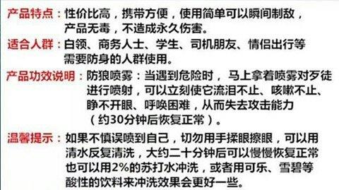 不要把防狼喷雾剂当成玩具,不要随便射出。避免喷洒对着他人、动物或与警察的交流中使用。