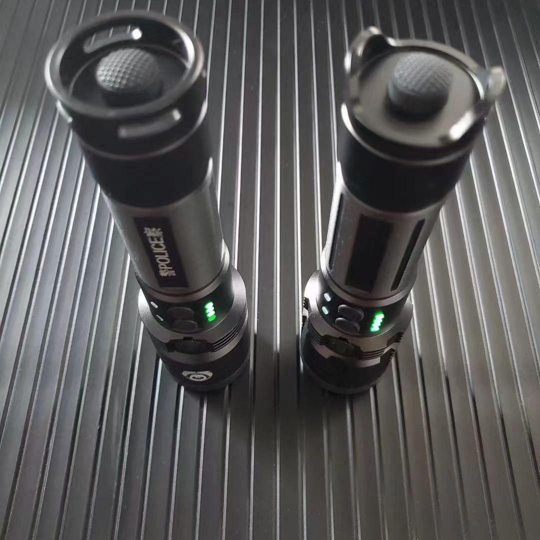 此手电筒拥有电量显示功能,尾部开关开启后显示,1格灯亮(25%电量),2格灯亮(50%电量),3格灯亮(75%电量),4格灯亮(100%电量)
