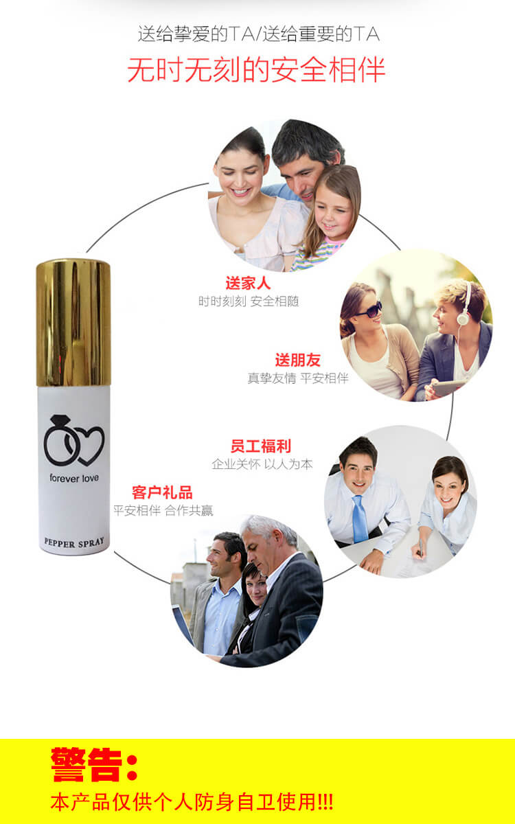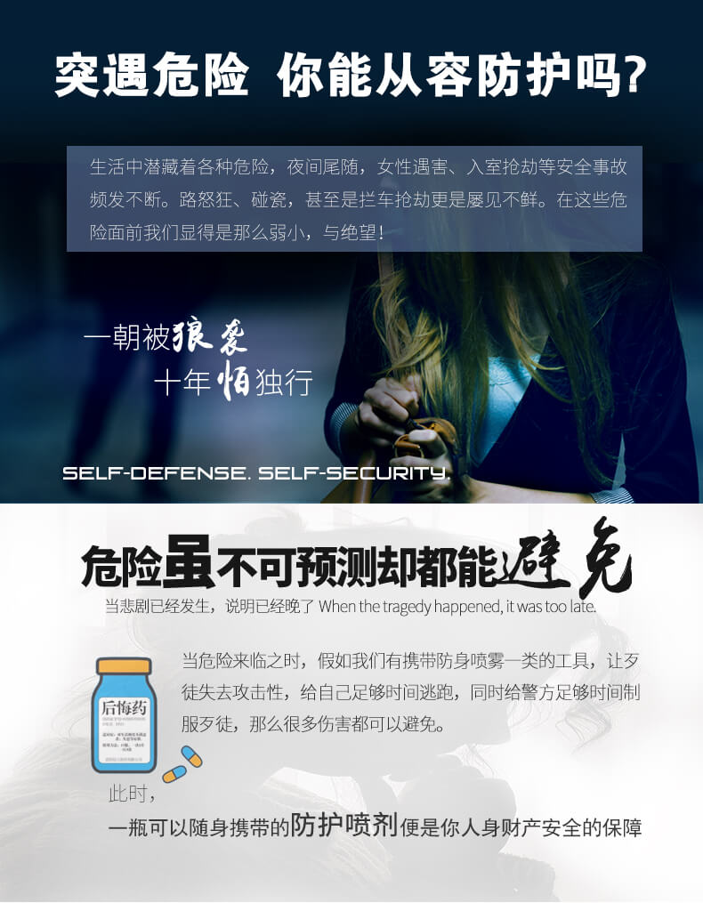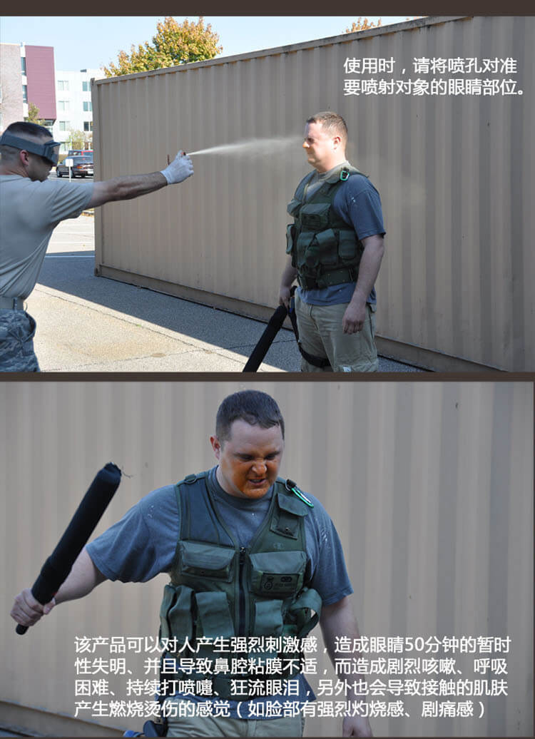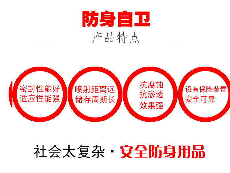 全新爆款进口圣马防狼喷雾,体积小,威力大,喷射力度强,精致外观,头部激光雕刻LOGO勋章,请认准!该产品可以对人产生强烈刺激感,造成眼睛50分钟的暂时失明,并且导致鼻腔粘膜不适,而造成剧烈咳嗽、呼吸困难、持续打喷嚏、疯狂流泪、另外也会导致接触的皮肤产生燃烧烫伤的感觉(如脸部有强烈的灼烧感、剧痛感)注意事项:请在通风的环境下使用,使用时请将手伸到外面,将喷孔对准要喷射的目标的面部